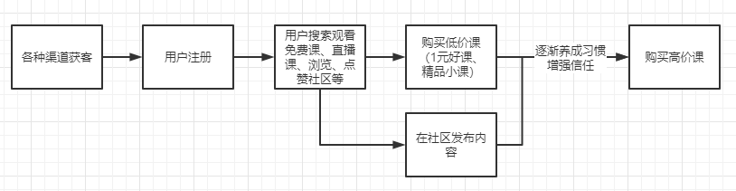 注册-》观看免费课程/浏览社区-》发布内容-》购买课程
