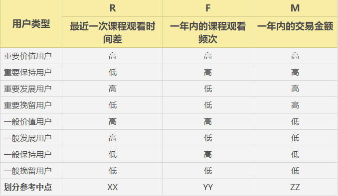课程消费模块用户对应的是服务消费型用户,使用RFM模型进行分层。