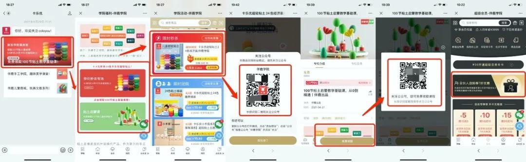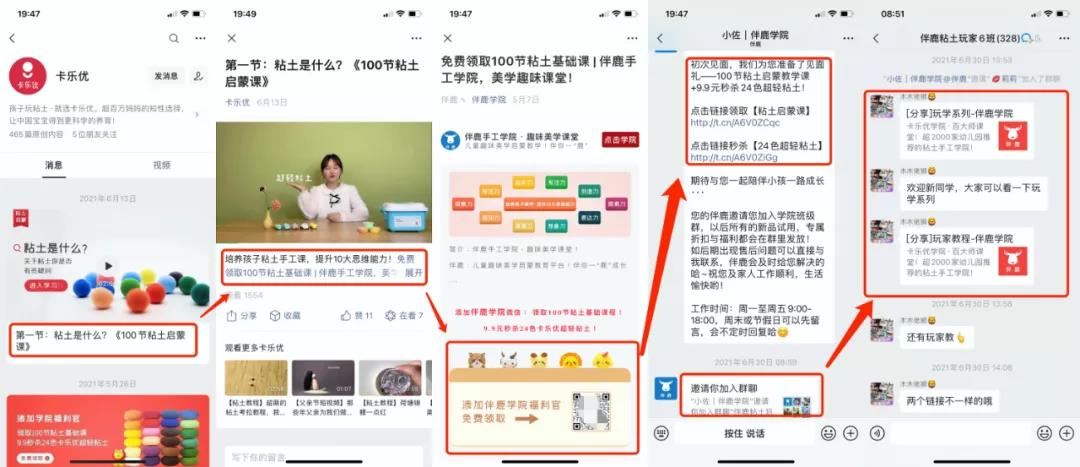 链路二:用户浏览卡乐优近期的文章,点击免费领取100节体验课即会链接到伴鹿学院的文章,文中扫码添加伴鹿学院学院福利官,同样可收到免费课程和秒杀活动的链接,以及伴鹿粘土玩家班级群的邀请。