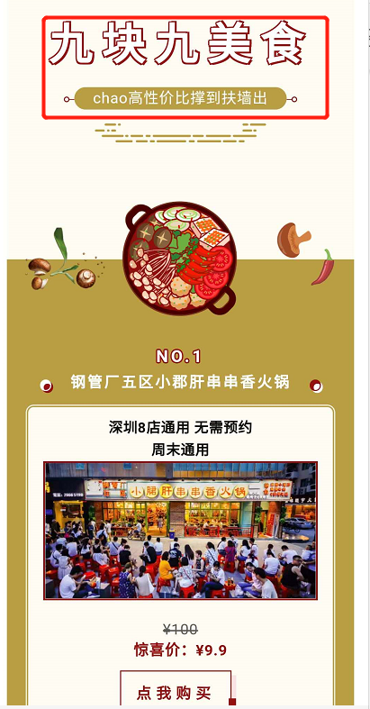 本次活动推出"九块九美食"的亮点,各家店铺推出的套餐也均跟9.9有关,在具体套餐设计上根据店铺特色做了细化,且具有一定的限制条件。