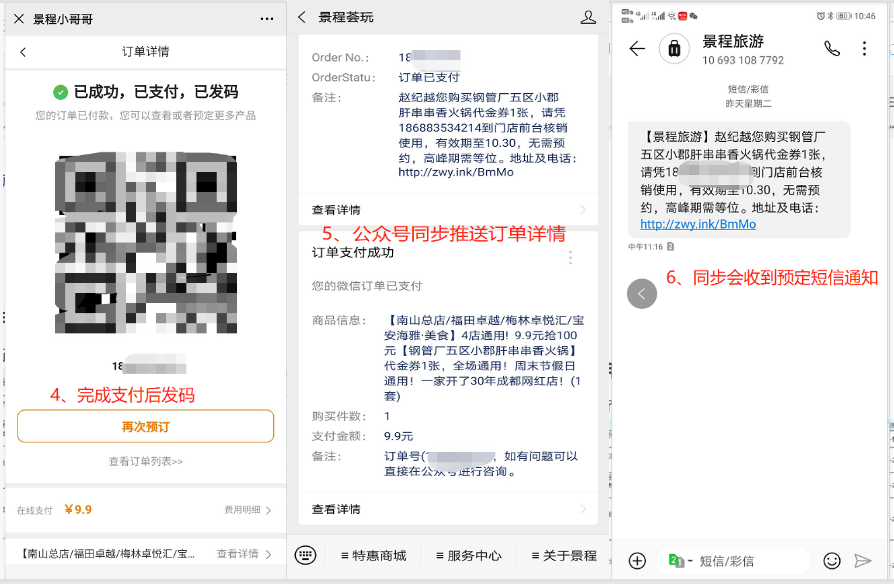 完成支付后会跳转提示支付成功并发二维码,在支付成功同时在公众号以及手机短信会收到订单信息及详情的推送触达。