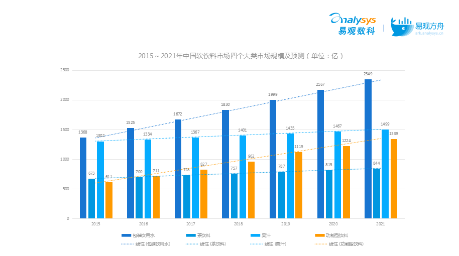 - 二是增长快:中国软饮料市场四大品类分别是包装饮用水、茶饮料、果汁、功能性饮料。如图所示,从2015年-2021年增长趋势图可以看出,四大品类一直呈持增长势头,其中包装饮用水和功能性饮料的增长速度非常快。