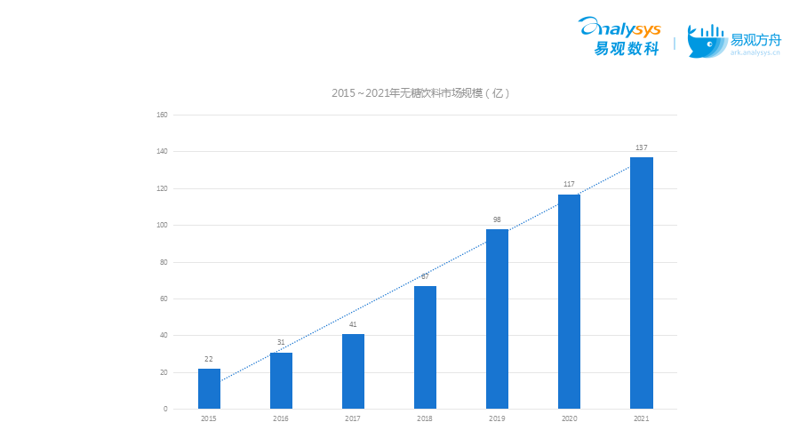 再来看为什么要选择无糖赛道。如下图所示,无糖市场从2015年22亿增长到2020年117亿,增长速度惊人。
