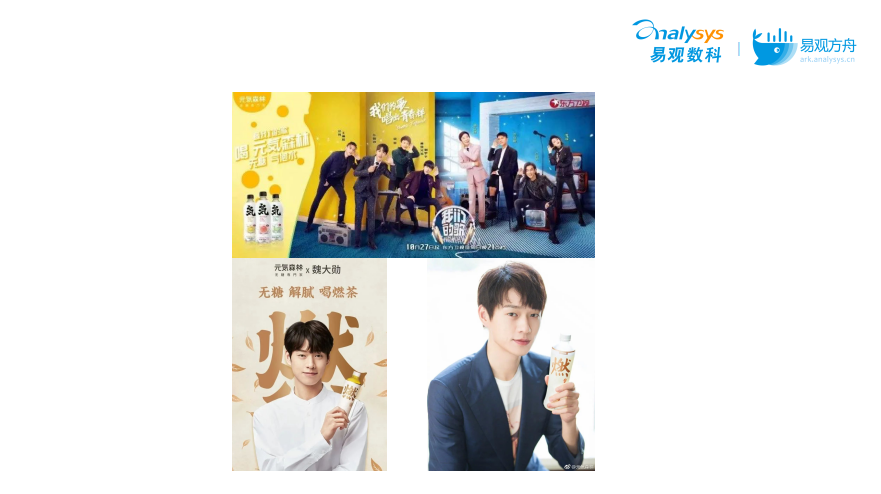 例如,元气森林自2017年推出首款茶饮料、黑白包装的"燃"茶以来,燃茶先后获得魏大勋、黄晓明、成龙、费启鸣等多位明星点赞打call,魏大勋更是在《拜托了冰箱》里晒出满满一冰箱的燃茶,成为了燃茶的代言人。