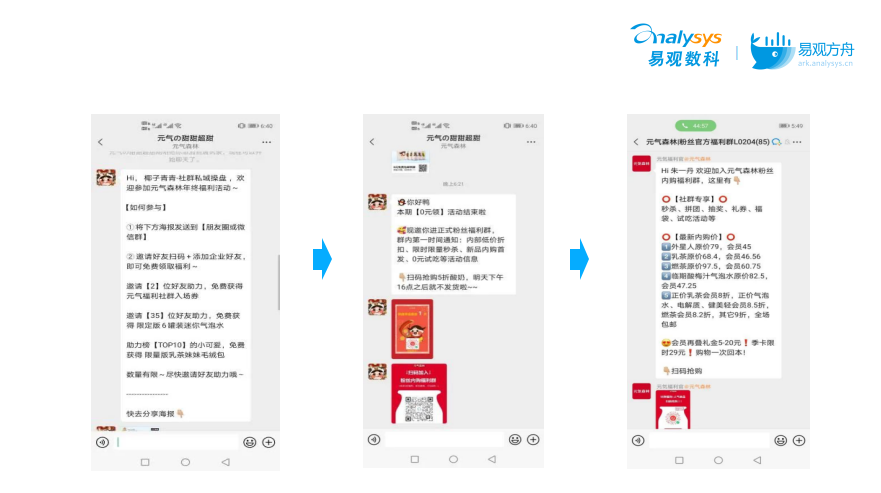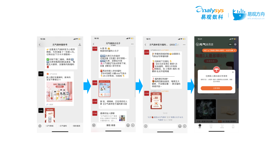 从微信群运营层面来看,用户进群后发放剩余优惠券,后续通过不定期高频地推送优惠商品(如秒杀商品)带动转化;从元气森林服务号运营的全链路过程来看,每一步路径都十分清晰。