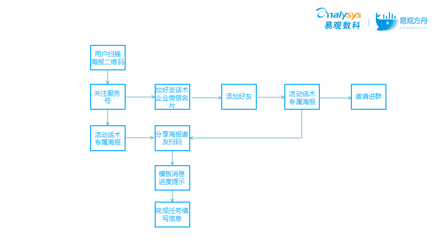 用户扫描海报二维码后关注服务号,服务号引导用户添加企业微信好友,再推送活动相关话术和专属海报,然后由用户分享海报邀请好友扫码。在这个过程中,服务号会通过模板消息提示进度情况,完成任务后再填写任务信息(如地址等收货信息)。在活动结束后,企业微信会把用户拉到社群里进行后续社群运营。