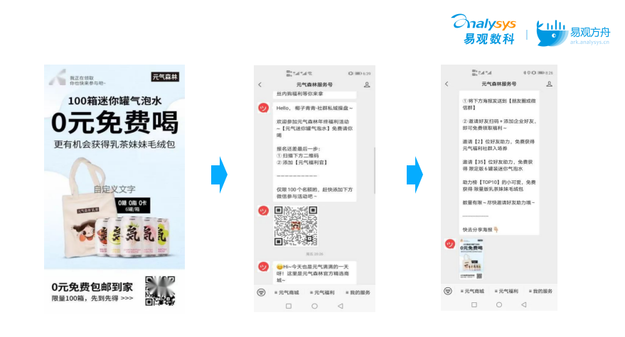 元气森林会通过任务宝裂变进而为服务号快速增粉,即通过诱人的福利,引导用户邀请好友助力(关注服务号)后免费领取礼品,并会把用户沉淀到企业微信和社群。