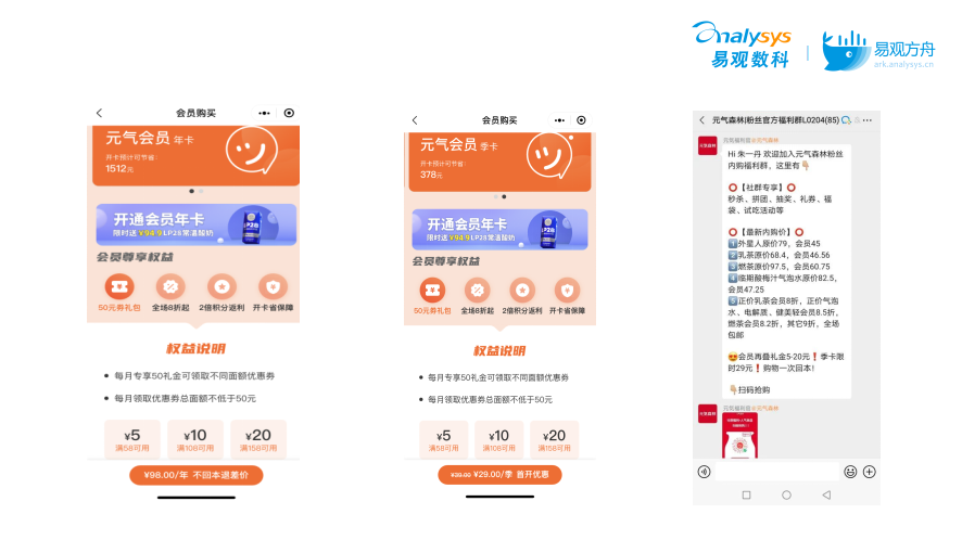 就会员加入形式而言,分为年卡(98)和季卡(29)两种。据统计,元气森林会员已超一万人次,大部分都是季卡用户,再通过会员售卖活动发展自己的忠实粉丝或铁粉。例如,社群中售卖会员卡、推广会员内购价、小程序开卡送酸奶等。
