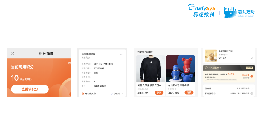 - 积分消耗方面。用户所获积分可以在小程序商城里兑换元气森林周边和相关衍生品。其次,在消费的过程中,积分也可以抵扣现金。