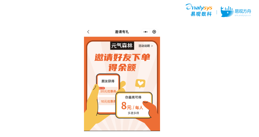 例如,元气森林小程序设置的邀请有礼活动就是邀请好友下单得余额,即用户在邀请好友成功下单后该用户可获得8元返现,而邀请成功的好友可获得10/20元优惠券。