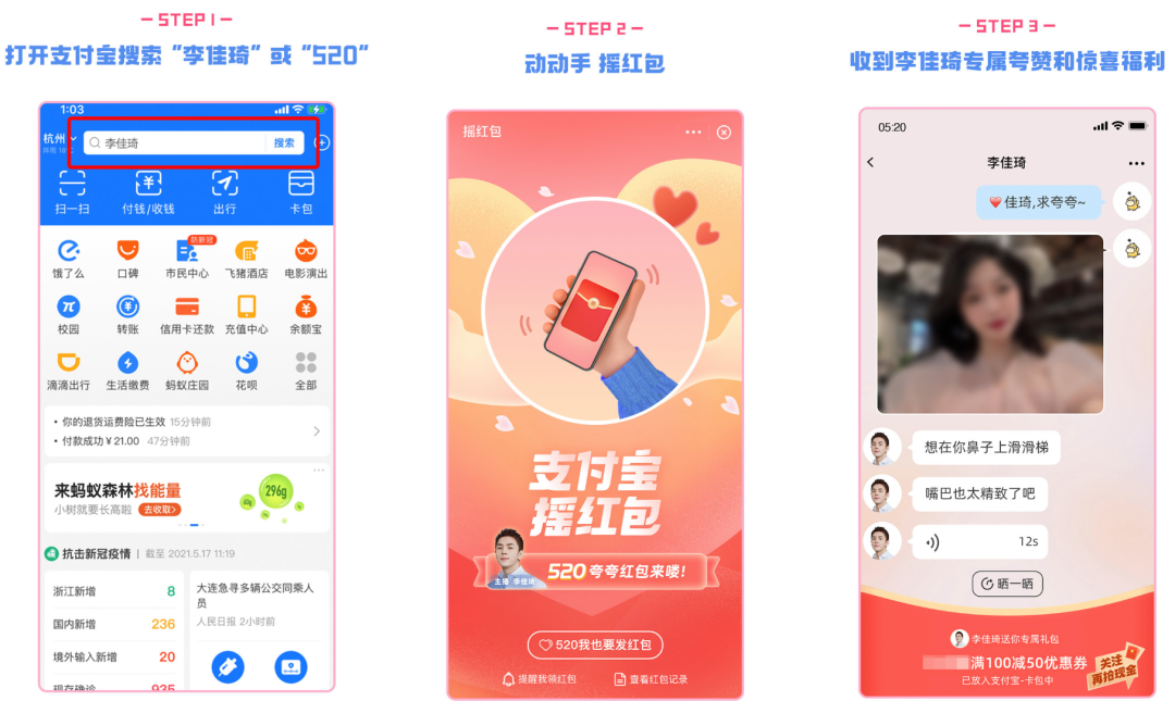 今年520李佳琦团队就将二者巧妙融合,通过支付宝搜索红包玩法,使其自运营的支付宝小程序用户量提升了5倍,并帮李佳琦直播间单场人气突破1个亿新纪录。