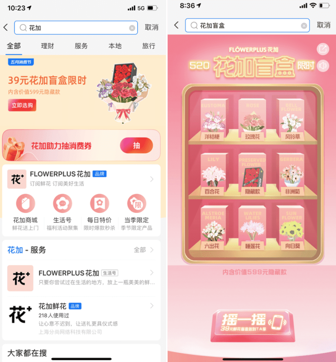 比如鲜花到家品牌花加,通过「搜索关键词+盲盒」的新玩法,帮其支付宝小程序拉新增长近20倍,订单量提升13倍。