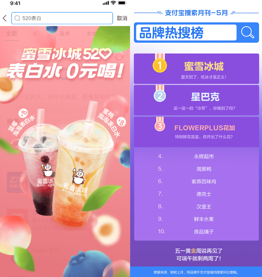 再比如,蜜雪冰城,抓住520等营销节点,打通线上玩法(通过支付宝搜索发放优惠券和0元表白水抽奖)和线下活动(新品、店庆),带动蜜雪冰城以超过400%的增幅,登顶支付宝的5月搜索品牌榜。
