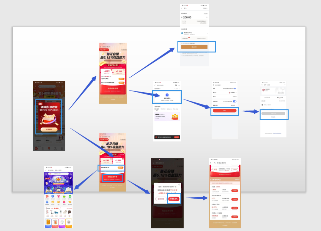 通过页面文案和简单交互,配合增加理财收益的方式激活潜在用户;页面没有明确6.18%是年化还是短期收益增值,让用户产生理解歧义,进而继续完成操作了解活动。