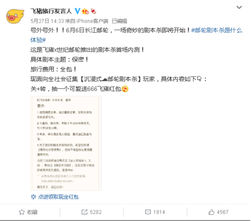线下活动这块,目前已经做过较多探索的其实是文旅行业与剧本杀的结合。过去旅游景点的体验营销模式常常是"你演我看",而在剧本杀的模式下,游客可以通过现场体验互动的游玩,变成"我来演"的模式,对消费者的吸引力也就更大。