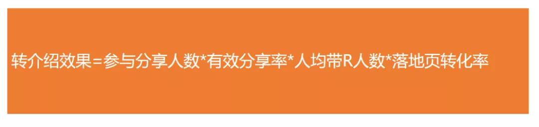 所以,我们可以将海报分享类的效果外化转介绍活动统一一个增长模型公式为:转介绍效果=参与分享人数*有效分享率*人均带R人数*落地页转化率