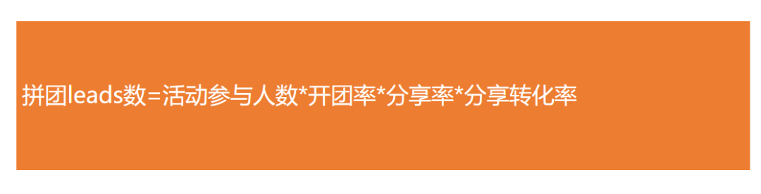 同样的,我们可以拆解出拼团的增长模型:拼团leads数=活动参与人数*开团率*分享率*分享转化率