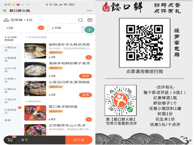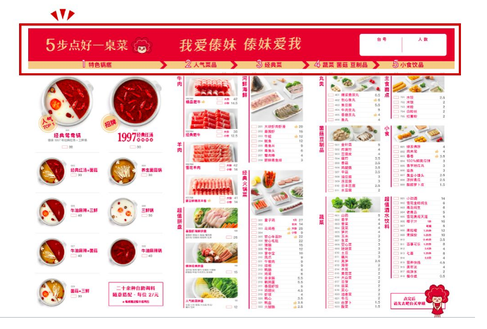 客人开始点菜,昨天的案例拆解我也有提过,我们的菜品是按照一定的逻辑来编排的(先点锅底,然后点肉,接着点素菜……),这是让客人可以一步步点下去,不会觉得混乱,不会点漏。