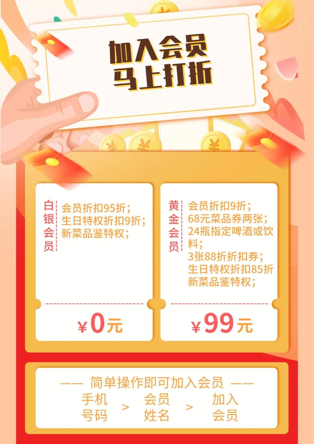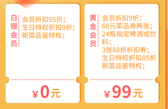 我们的会员分免费和收费两种,其实会员权益设置也没有出彩的地方,利益点就是折扣和送菜品。