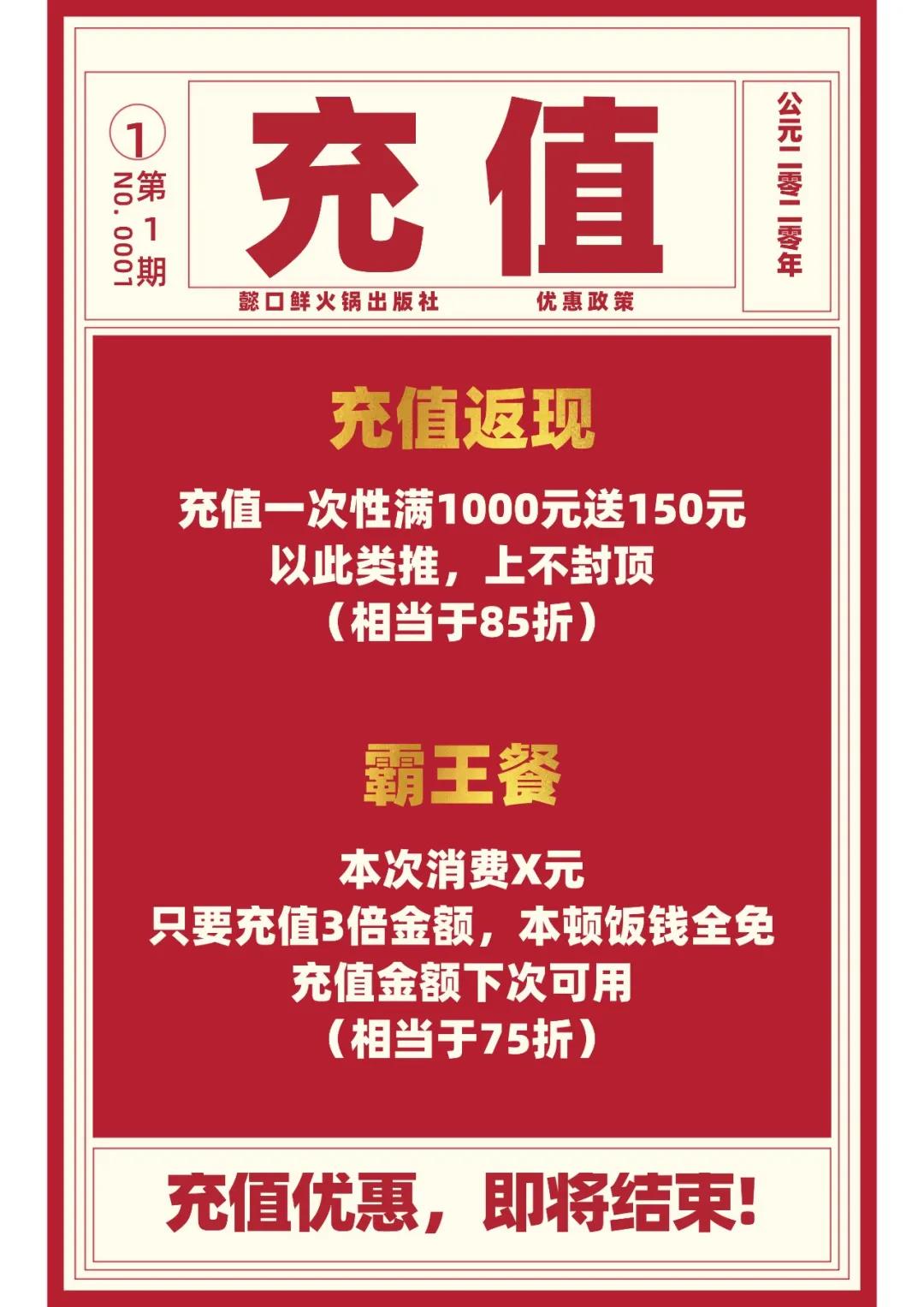 我们的充值起步价不算低,1000起充,而且赠送的金额不多,充1000送150。还有一个方案是充值当天消费金额的三倍,就可以免掉当天的餐费。其实都是老掉牙的充值方案了,没什么好说的。