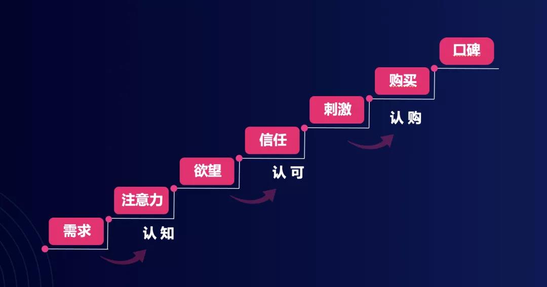 用户购买前后的路径,一步步拆解下来依次为需求、注意力、欲望、信任、刺激、购买和口碑,整个下来是一个用户走完的路径,也是一个推理的过程——每一步是怎么产生的,一个人做决策、一个事物购买交易链路的形成分别都有哪些组件。