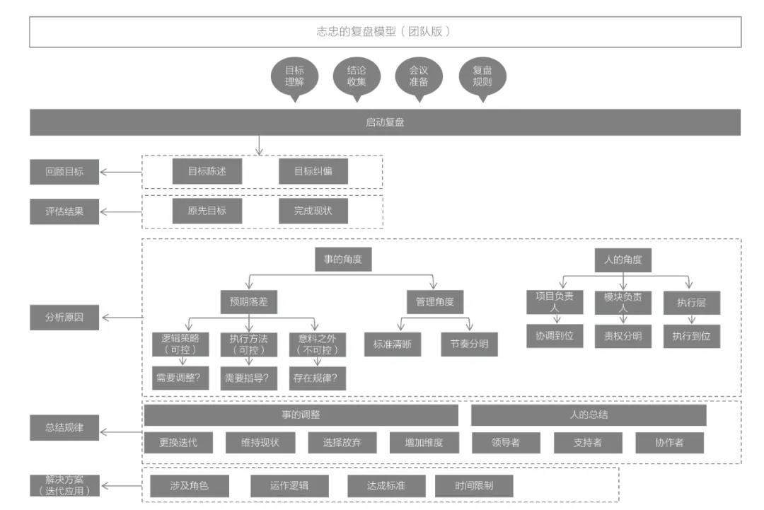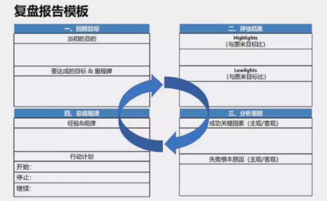 上图是联想设计的复盘模板,我个人认为这套模板的作用比较偏行动管理的层面,适合你在日常中使用。在这里就不展开介绍了。