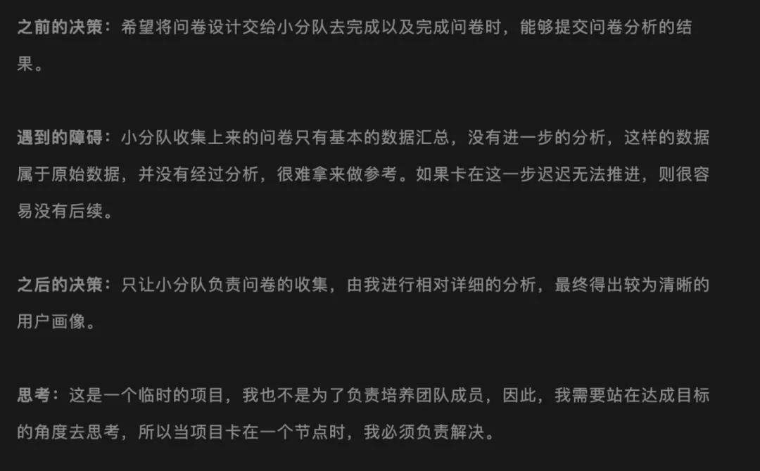- 在做决策的时候,我们多数纠结的点在于,在某些模块下决策边界的不清晰,即在做决定的时候要纠结什么,纠结多久,考虑到什么程度。复盘的时候可以将这些困扰你的地方给罗列出来,看看自己常见的卡点在哪里,事后可以尝试多写几种解决方案。在有了解决方案的时候,可以看看此前你自己遇到困难的时候是如何决策的,这样就可以了解自己的决策偏好。下图是我在做爆款案例库之后所做的复盘,该部分是我让团队去做用户调研时所做的决策,里面就把我做决策的过程给写了出来。