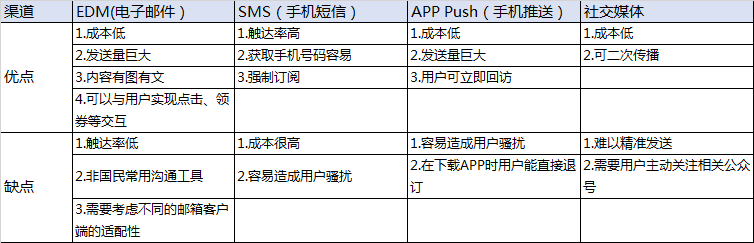 为了尽量确保有效性,在资源比较充裕的情况下,我们推介使用多渠道去触达用户,但是,为了避免过度骚扰用户,我们在给同一用户发送沟通时,需要注意渠道的排重。在我的经验里,一般是采取先使用社交媒体推送(如微信图文信息与客服信息),然后无法触达者使用APP推送,实在都无法触达的用户,我们再采取短信推送,而EDM由于属于PC端的内容,则可以独立运营之。
