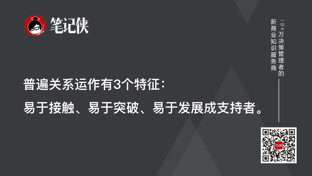 普遍关系运作有3个特征:易于接触、易于突破、易于发展成支持者。