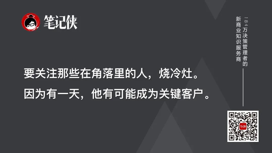 要关注那些在角落里的人,烧冷灶。因为有一天,他有可能成为关键客户。