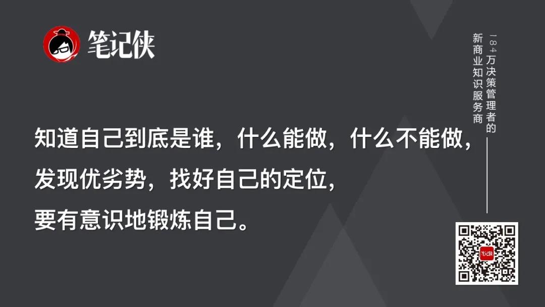 当然,也了解自己的情况。知道自己到底是谁,什么能做,什么不能做,发现优劣势,找好自己的定位,要有意识地锻炼自己。
