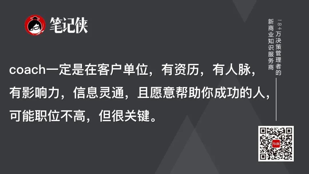 coach一定是在客户单位,有资历,有人脉,有影响力,信息灵通,且愿意帮助你成功的人,可能职位不高,但很关键。