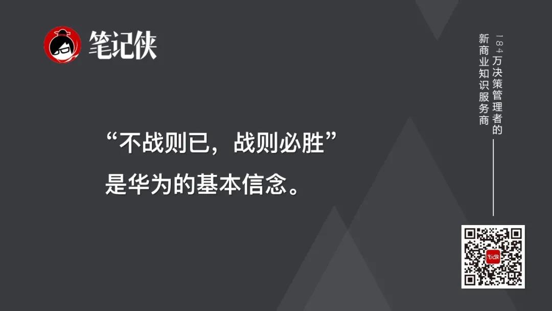 华为精神就一个字:赢。"不战则已,战则必胜"是华为的基本信念。