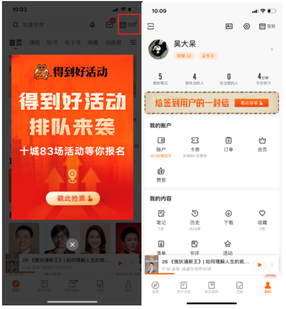 签到在首页和个人中心都有入口,如果每日都有使用得到APP的习惯,签到入口的小红点就是很好的行为触发器;