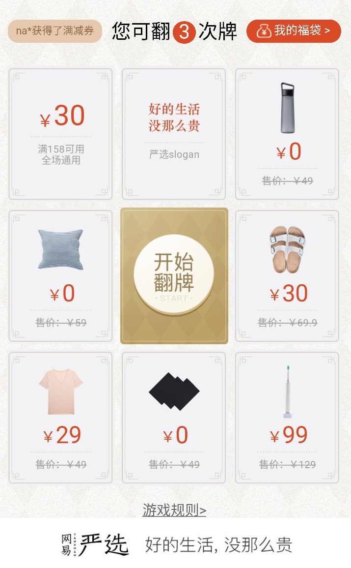 网易严选在用户进行购买后,会给予用户一定的返利,它们将这样子的返利包装成一个探索未知的小游戏——翻牌子。这就是典型的在忠诚度建设当中镶嵌内部动机的好样板。