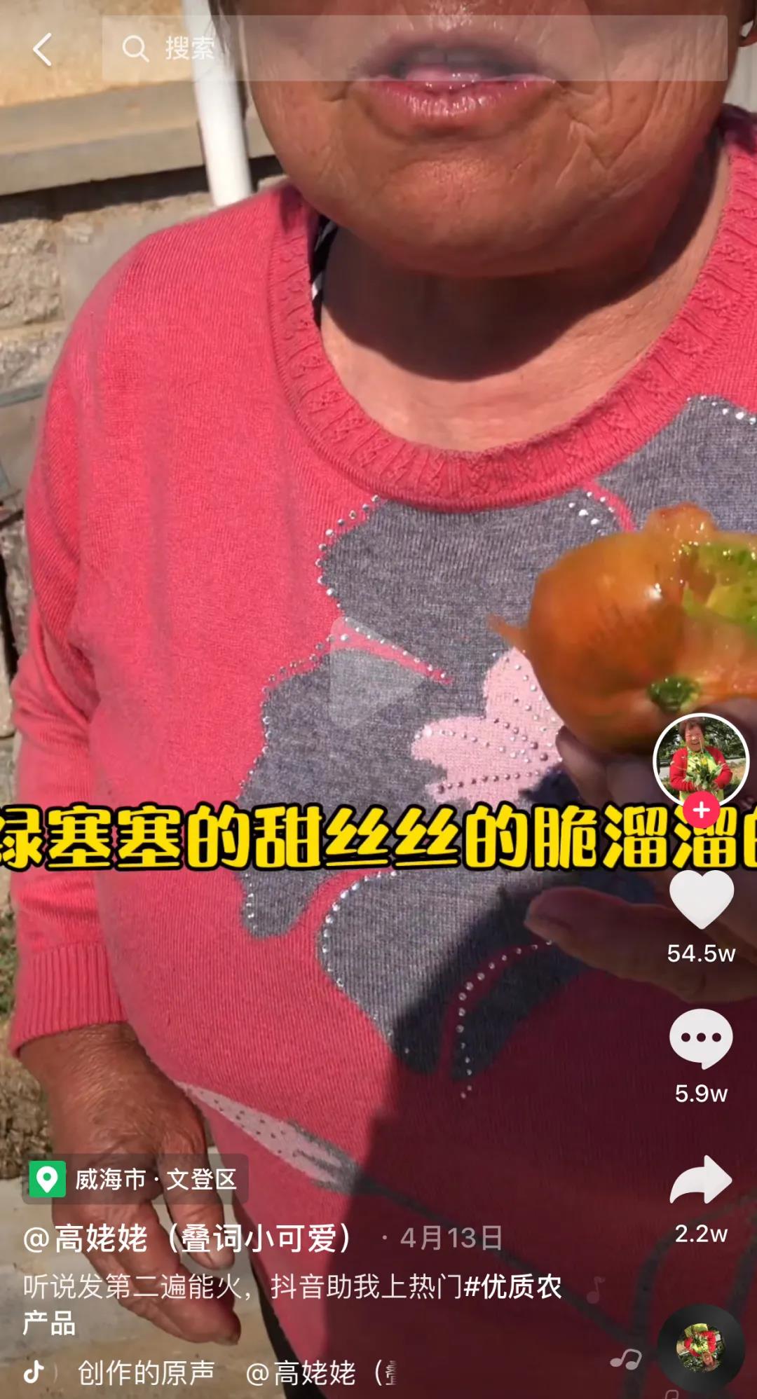 "我喜欢吃这个绿塞塞的、甜丝丝的、脆溜溜的。我就喜欢绿色的、酥脆的、脆溜溜的、酸溜溜的好吃。"拿个带点绿的番茄,高姥姥一口气说五六个叠词,能有50万+的点赞。