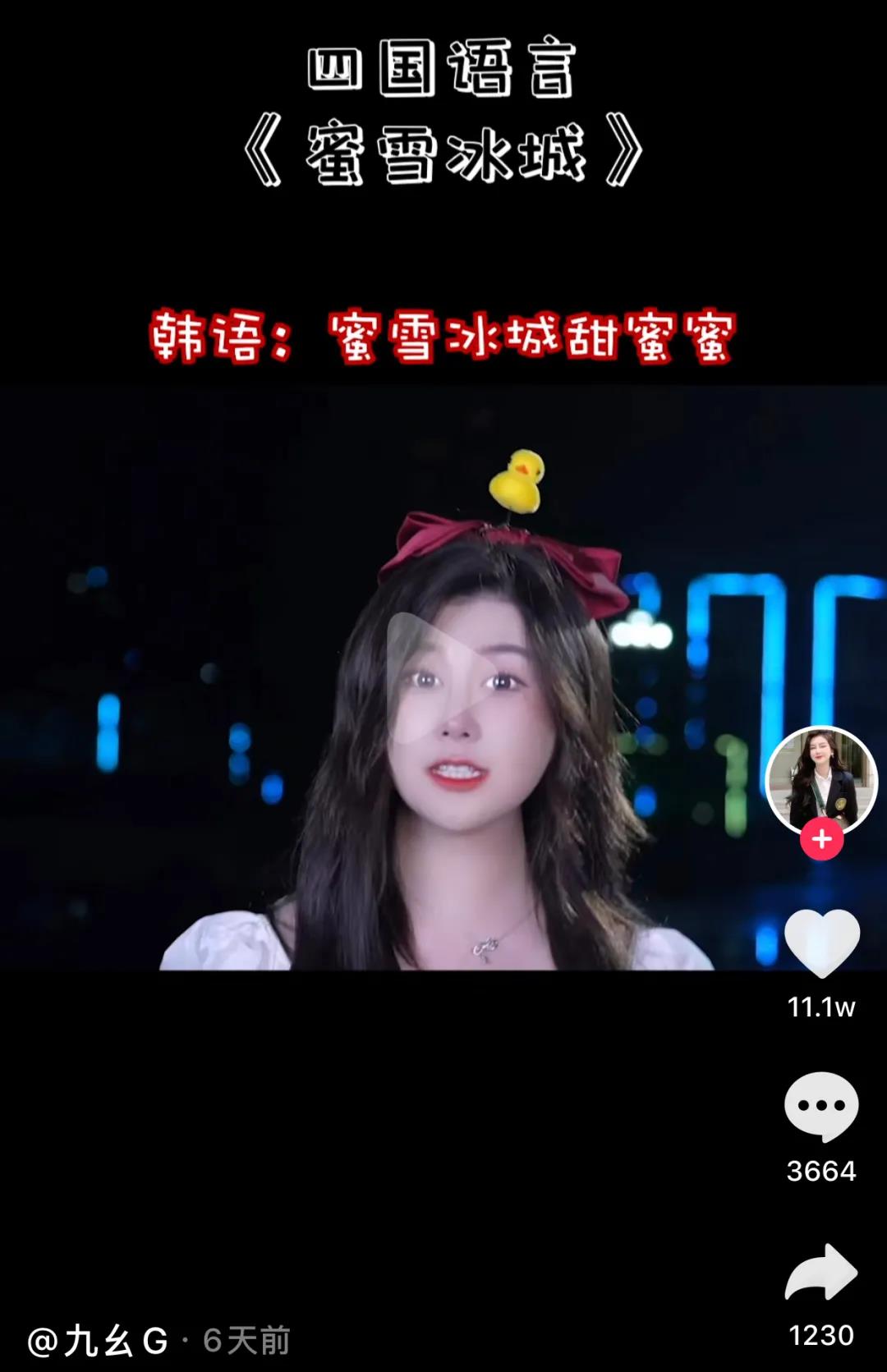 细分品类之下,还有"杠上开花"的集大成者——韩初九在一个视频里分别演唱了京剧版、越剧版、黄梅戏版、沪剧版、评弹版、探清水河版。九幺G唱了"中英日韩"四国语言版,日语卡哇伊,韩语女团味儿,英语是乡村音乐风。