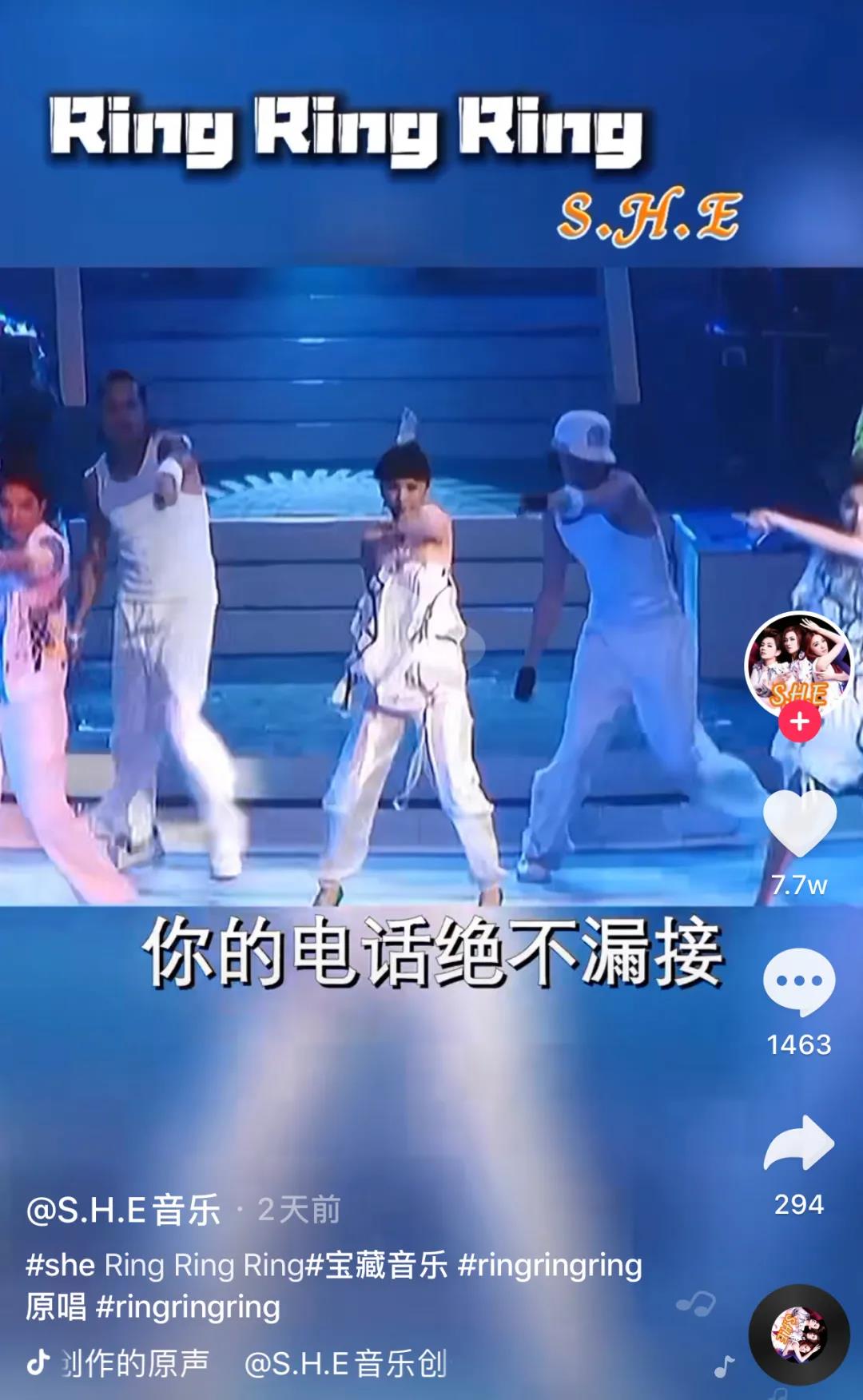 在抖音,同样文艺复兴的还有SHE发行于2006年的歌曲《Ring Ring Ring》。在内地,该歌曲曾被用作动感地带的广告歌,因此副歌部分的原版和广告版有所不同。原曲"管他网外或是网内,月底再考虑通话费"被改成了内地版的"喝水都嫌浪费时间,口渴也要声音甜美"。