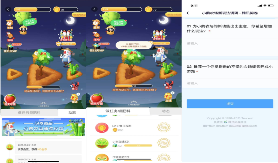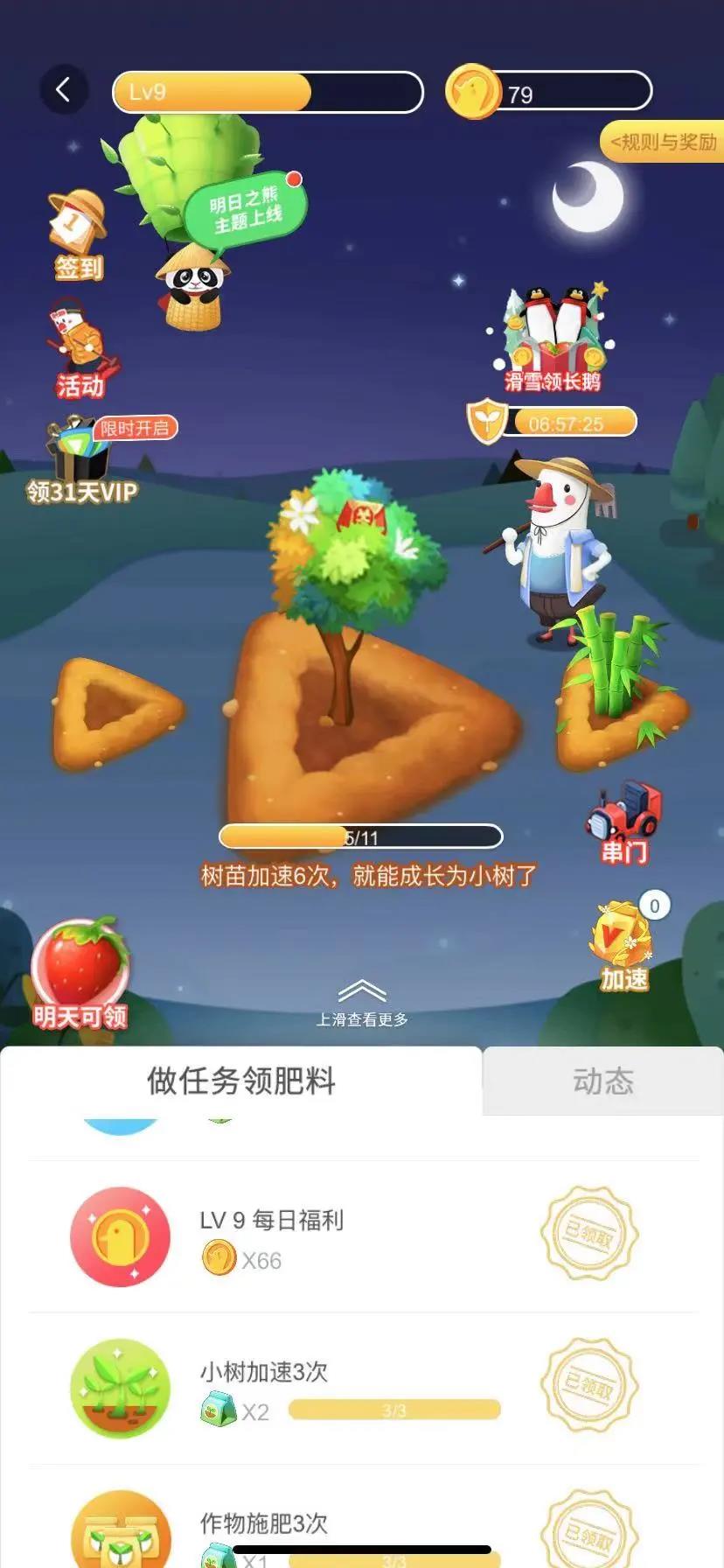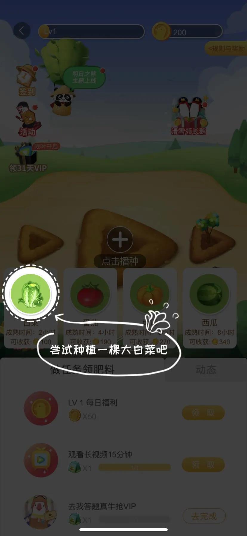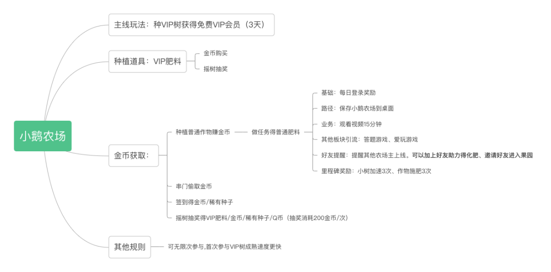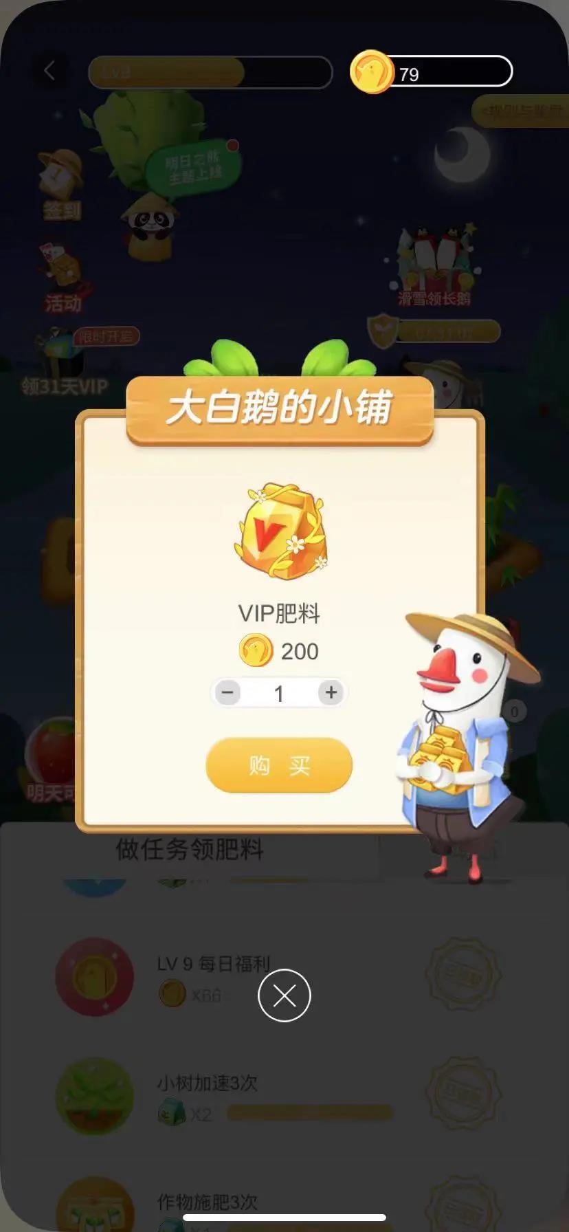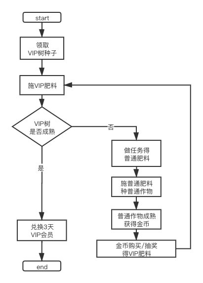用户需要先通过做任务获得普通肥料,给普通作物施肥,普通作物产生金币,金币再购买VIP肥料种植VIP树木,VIP树木成熟才能兑换最后的目标奖励。