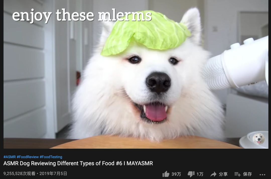 这一类别中,最常见的是宠物搞笑类视频,而近几年极具代表性的内容则是宠物吃播。2018年9月,萨摩耶Maya的主人在YouTube上传了她吃西瓜的视频——这则视频迅速掀起#dog asmr#的风潮,播放量突破100万次,无数人被Maya的毛发、神态与咀嚼声深深吸引。