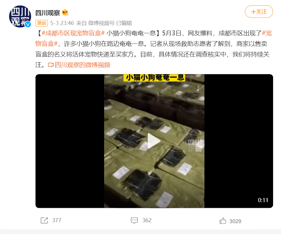 媒体报道宠物盲盒。图片来源:微博@四川观察