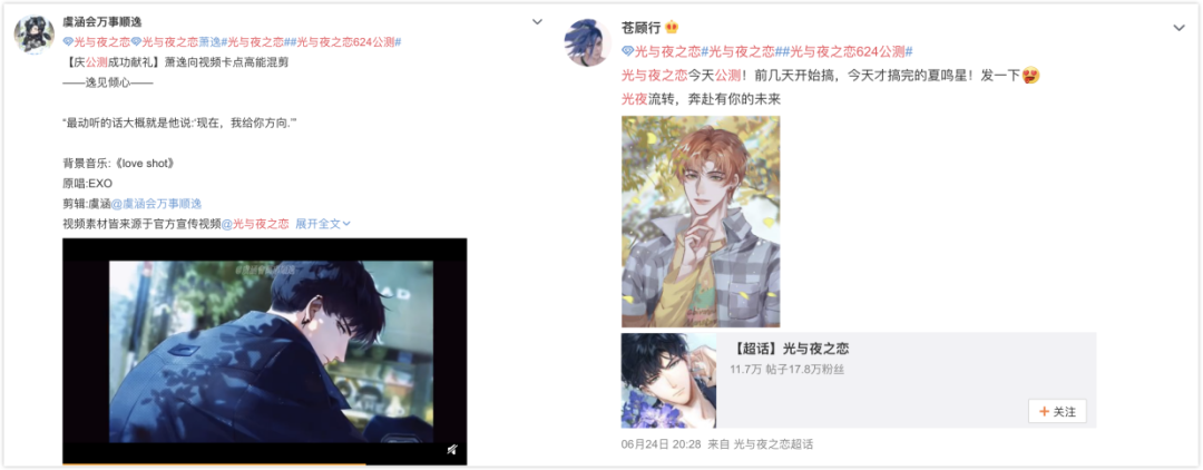 在光与夜之恋超话中,用户能够看到不少游戏宣传视频,游戏相关优质内容,这些内容中,既有官方输出,也有一些游戏领域KOL的联动种草,还有不少内测用户的游戏感受,原创的游戏角色混剪视频,让用户能够进一步了解这款游戏,激发用户对于这款游戏的兴趣。
