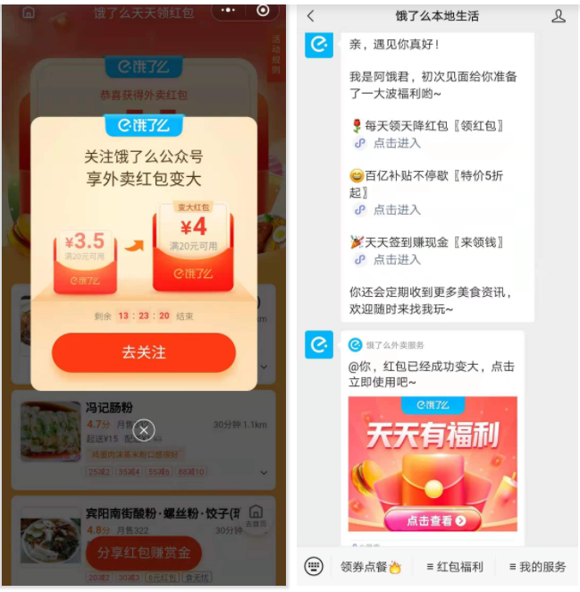 饿了么利用这个优势,通过社交营销将大量用户引流到小程序激活,再用公众号实现留存,形成触达-销转-留存-复购的闭环。