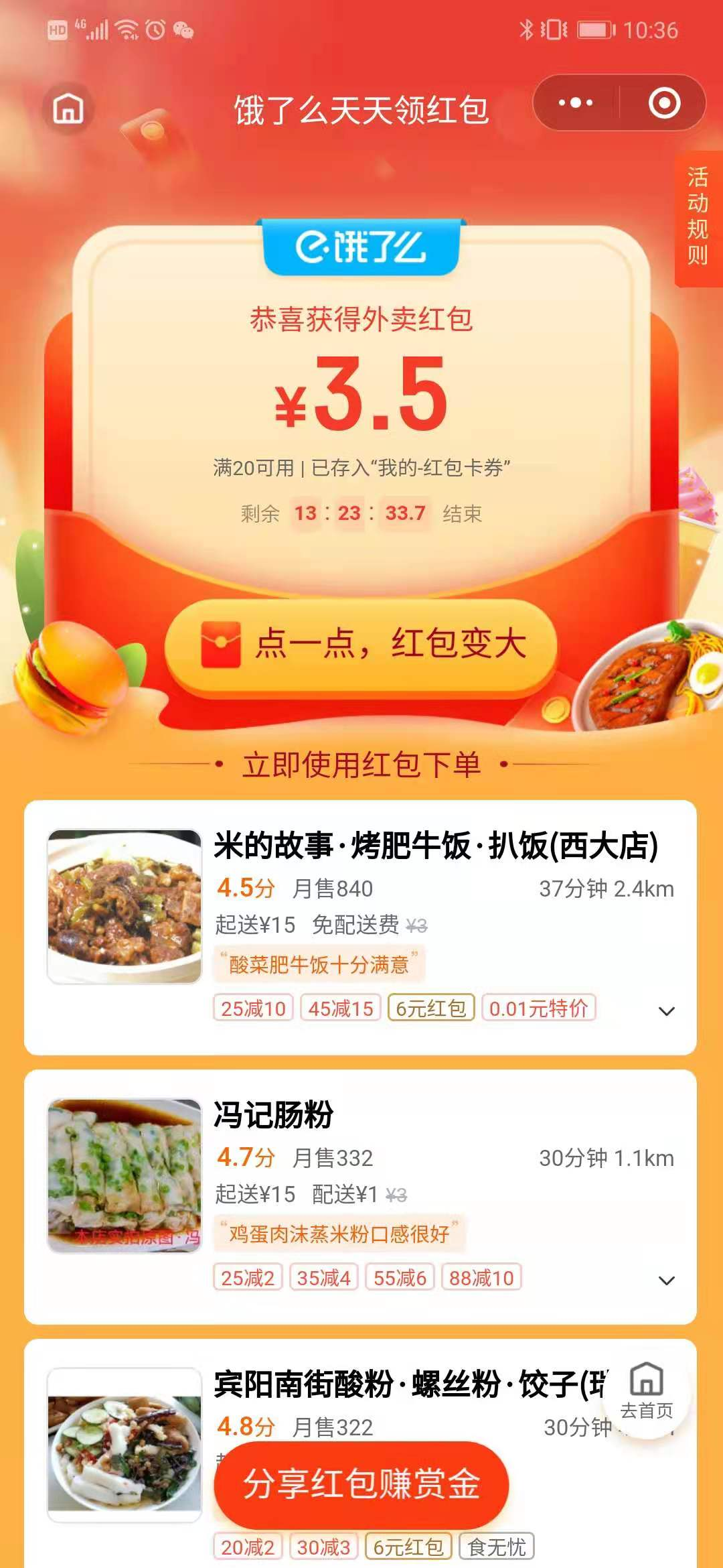 APP在首页浮窗设置了这个活动入口,但不是直接领取红包,而是活动分支的分享界面,可看出把传播重心放在了社交关系
