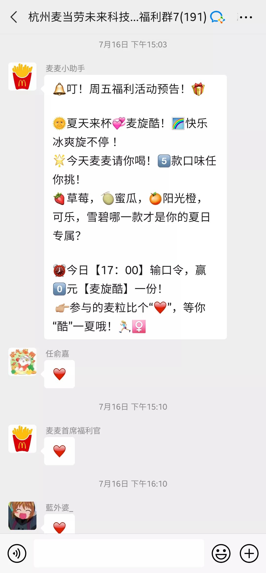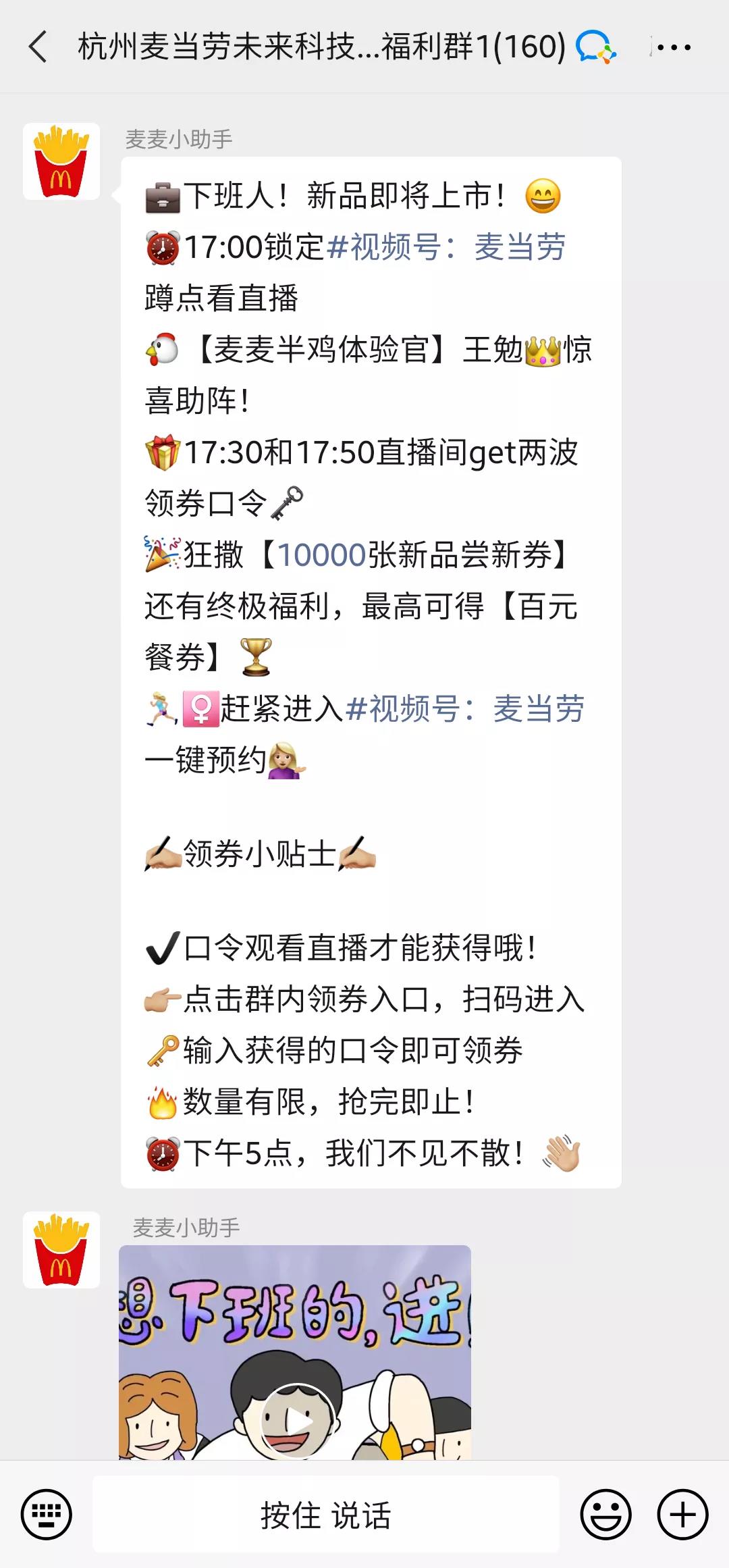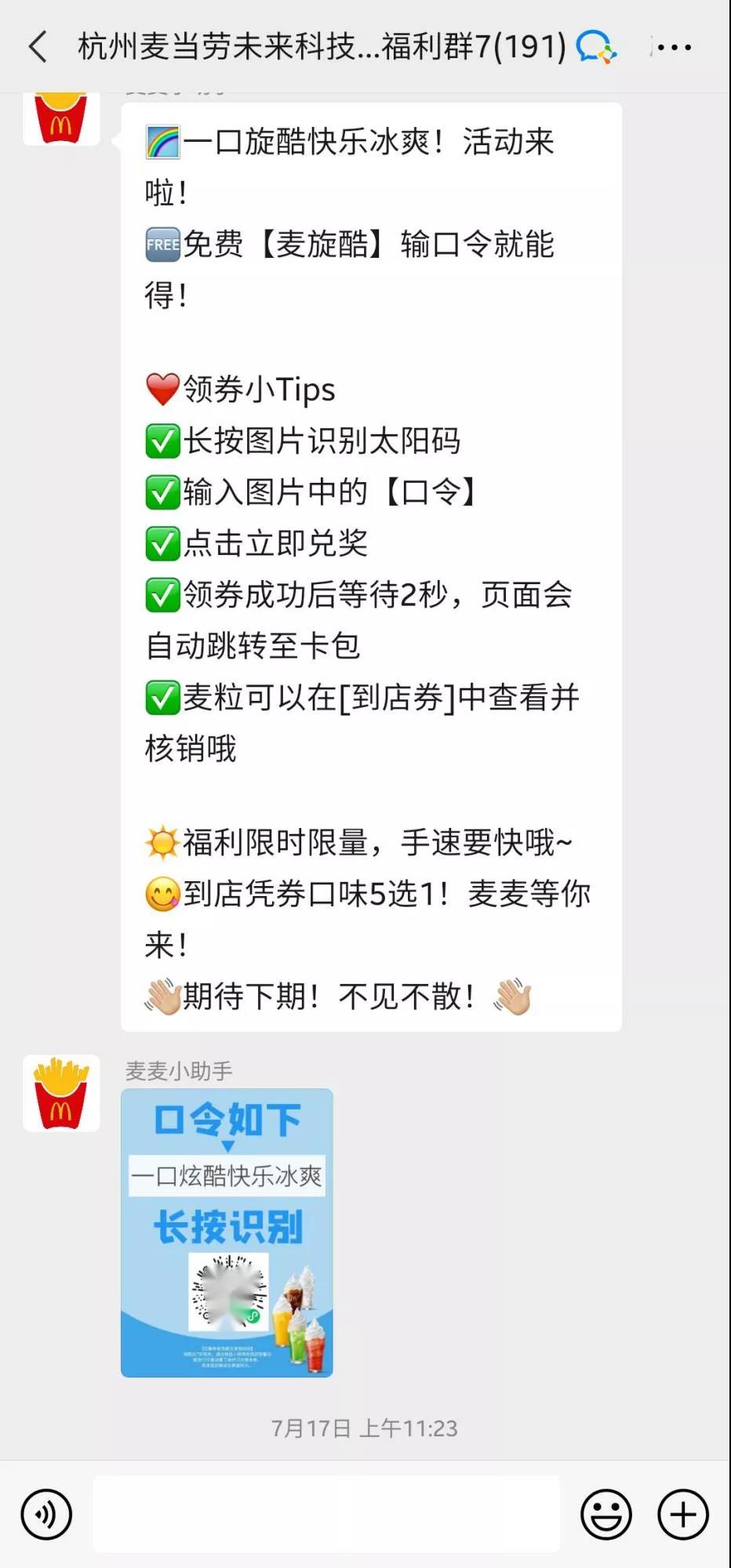 每周五17点,麦当劳的社群内都会推出“免费抢”的限时活动,通过输口令抢“到店券”的形式,为线下门店引流。