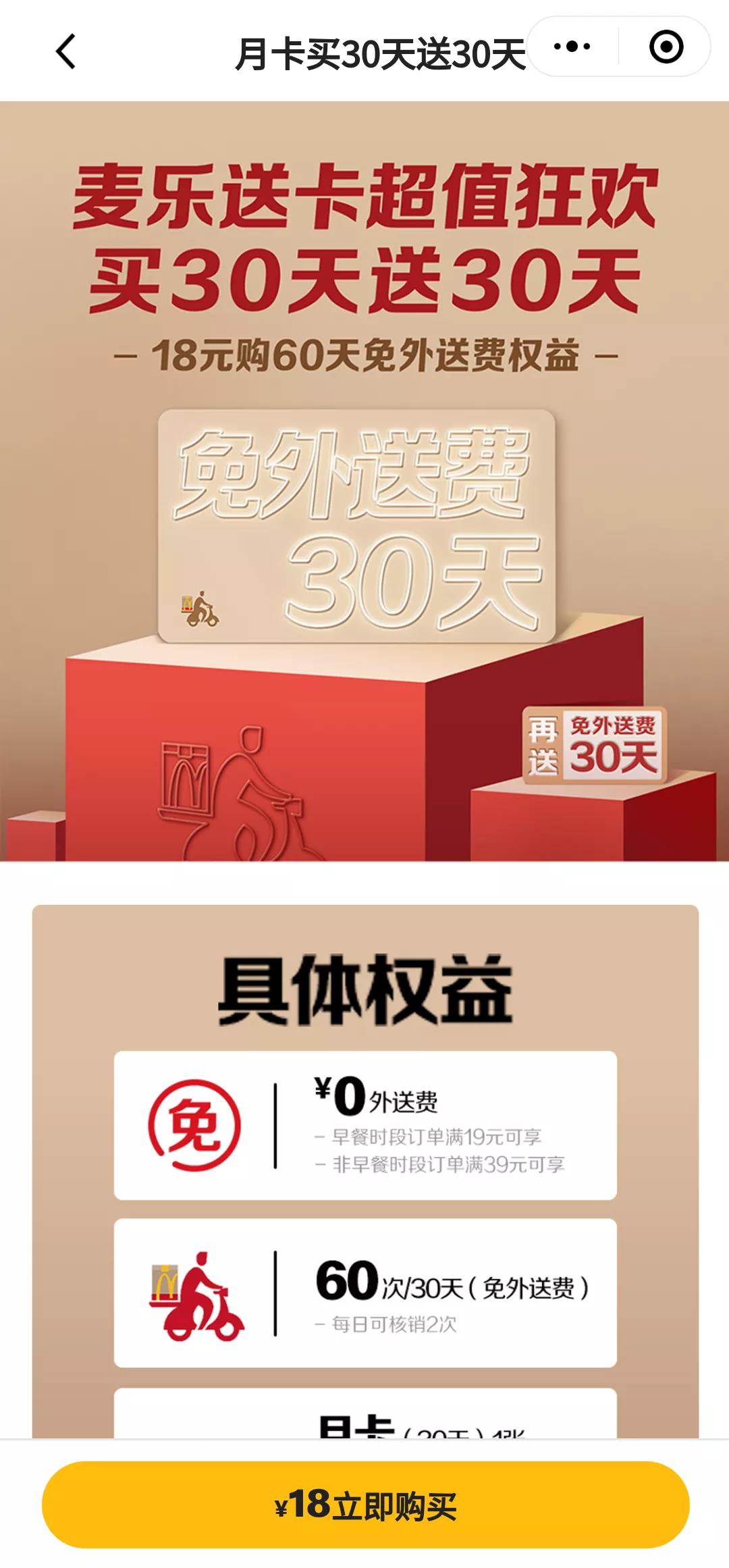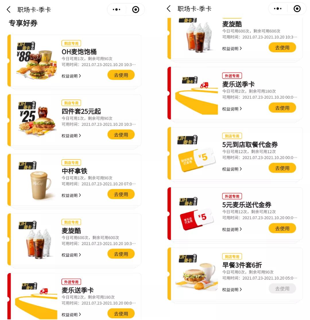 是麦当劳的爆款会员卡,主打职场人的正餐、外卖配送场景。