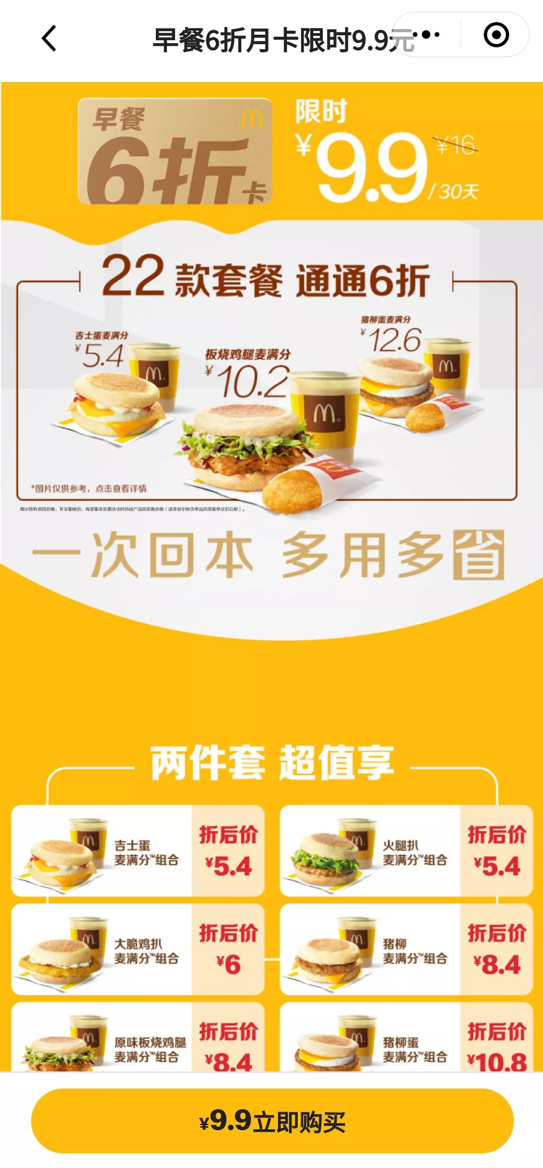 早餐卡的权益比较简单,只要9.9元就能享受到22款套餐的6折优惠,最低只要5.4元就能吃一顿。