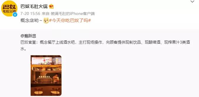 将毛肚的做法进行创新成功在市场中站稳脚跟的巴奴,官宣上线概念餐厅"酒水吧",主要向顾客提供现制饮料、现酿啤酒、鲜榨果汁3类酒水,开启了品牌的潮流经营/营销之旅。
