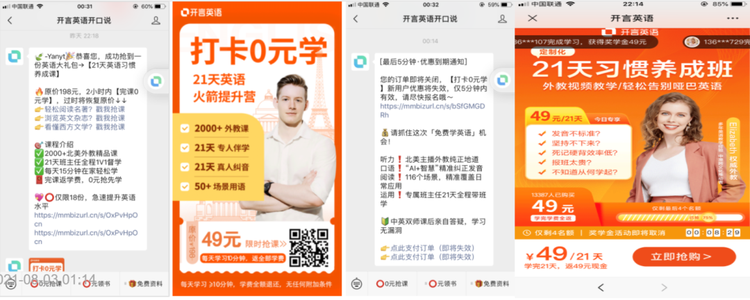 利用用户的从众心理,通过落地页的"反复滚动报名提示","剩余优惠名额","活动倒计时","打卡学习21天返还49元学费"等字样,催促用户付款报名进群。