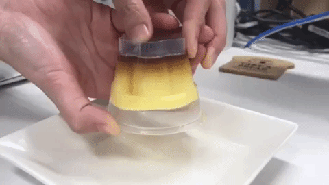 比如格力高的布丁,在包装底部设置了一个凸起的部分。只要按下去让空气进入杯内,布丁就会自动掉下来了。这样倒在盘子里吃布丁,既方便卫生,还能充满仪式感。
